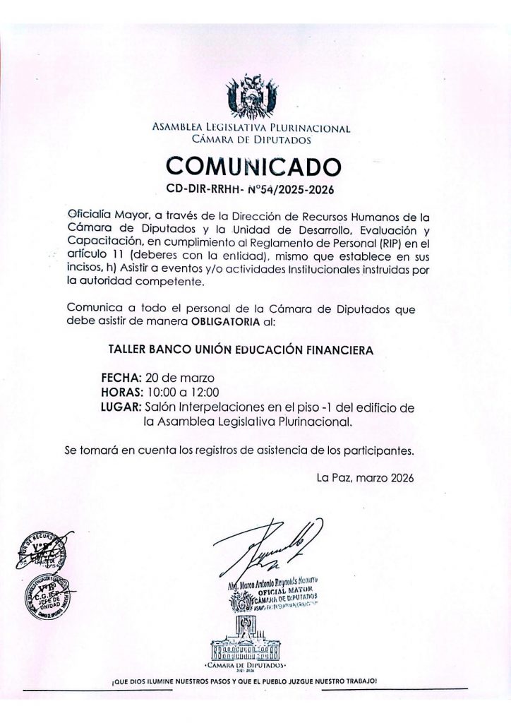 INSTRUCTIVO CD-DIR-RRHH – N° 15/ 2025-2026 EVALUACIÓN DE FUNCIONES DEL PERSONAL DEL ÁREA ADMINISTRATIVA E LA CÁMARA DE DIPUTADOS 2025-2026 Comunicado / Admin INSTRUCTIVO CD-DIR-RRHH – N° 15/ 2025-2026 EVALUACIÓN DE FUNCIONES DEL PERSONAL DEL ÁREA ADMINISTRATIVA E LA CÁMARA DE DIPUTADOS 2025-2026 Leer más »